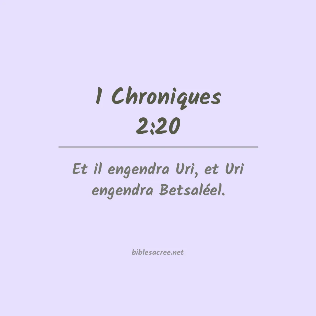 Le verset 1 Chroniques 2:20 se lit comme suit : « Hur engendra Uri, et Uri engendra Betsaleel. » Ce verset, provenant d'un passage de l'Ancien Testament de la Bible, établit une lignée généalogique en mentionnant trois générations d'ancêtres ; il mentionne Hur comme père d'Uri, et Uri comme père de Betsaleel. Cela situe Betsaleel dans sa lignée ancestrale et souligne l'importance de la transmission familiale et des généalogies dans les Écritures juives et chrétiennes.