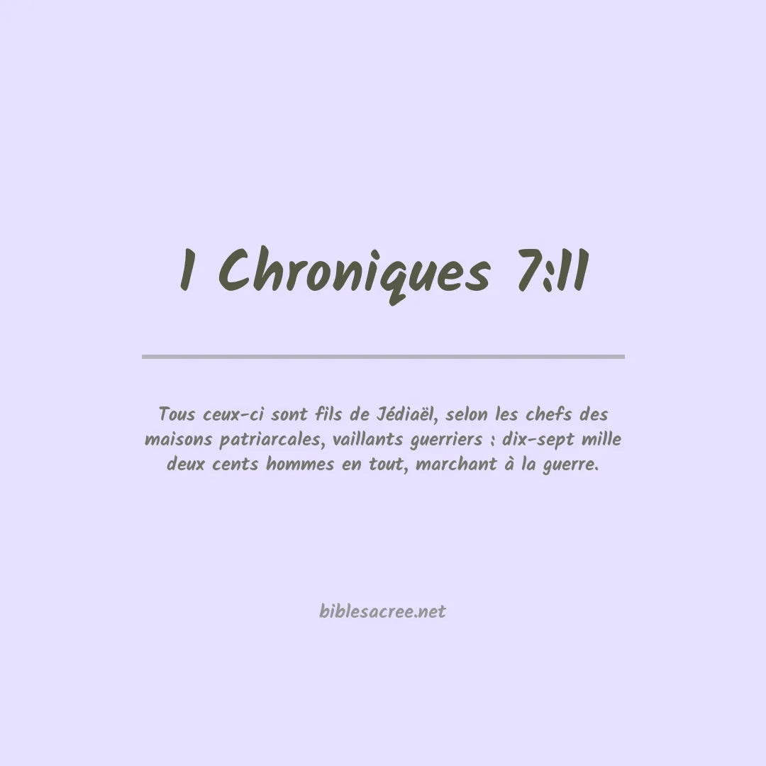 Le verset 1 Chroniques 7:11 (selon la version de la Bible Louis Segond) dit : "Tous ces fils de Jediaël, chefs de familles, hommes vaillants, au nombre de dix-sept mille deux cents, étaient en âge de porter les armes et de partir en guerre." Dans une phrase, cela pourrait être interprété ainsi : Ce verset souligne la bravoure et la préparation au combat de dix-sept mille deux cents descendants de Jediaël, qui étaient reconnus comme des chefs parmi leurs familles et prêts à servir en tant que guerriers.