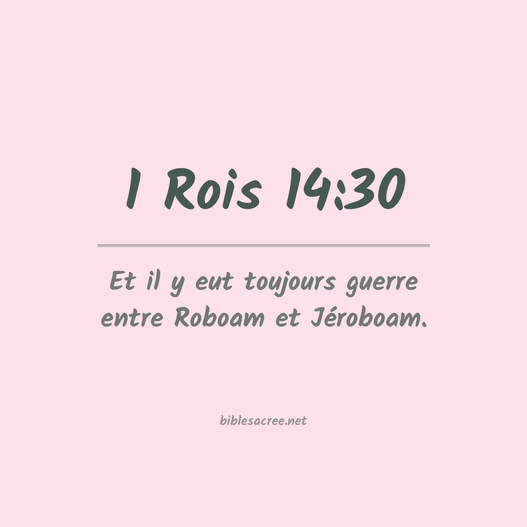 Le verset 1 Rois 14:30 dans la Bible décrit la tension continue entre deux royaumes après la division d'Israël, indiquant que "il y eut la guerre entre Roboam et Jéroboam tous les jours", soulignant ainsi l'état constant de conflit et de rivalité entre Roboam, le roi de Juda, et Jéroboam, le roi d'Israël, après la scission de l'empire uni sous le règne de Salomon.