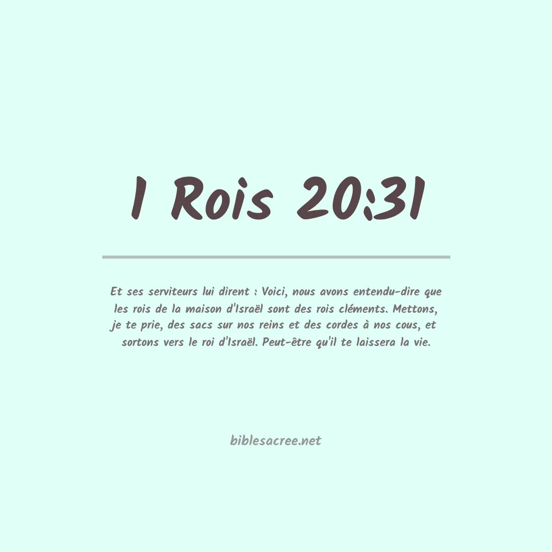 Le verset 1 Rois 20:31 (dans certaines versions, 1 Rois 20:31 peut être noté comme 1 Samuel 20:31 en fonction de la numérotation des livres de l'Ancien Testament) montre des serviteurs du roi de Syrie cherchant un moyen de sauver leurs vies après une défaite contre Israël. Ils décident de se présenter au roi d'Israël avec des signes de soumission et de repentance, en espérant obtenir le pardon et la clémence. Ils disent : "Voici maintenant, nous avons appris que les rois de la maison d’Israël sont des rois miséricordieux; partons donc mettre du sac et de la corde autour de la tête, et sortons vers le roi d’Israël: peut-être qu’il te sauvera la vie." (1 Rois 20:31 Louis Segond). Cette phrase exprime leur espoir que le roi d'Israël, reconnu pour sa clémence, pourrait épargner leurs vies malgré leur statut d'ennemis vaincus.