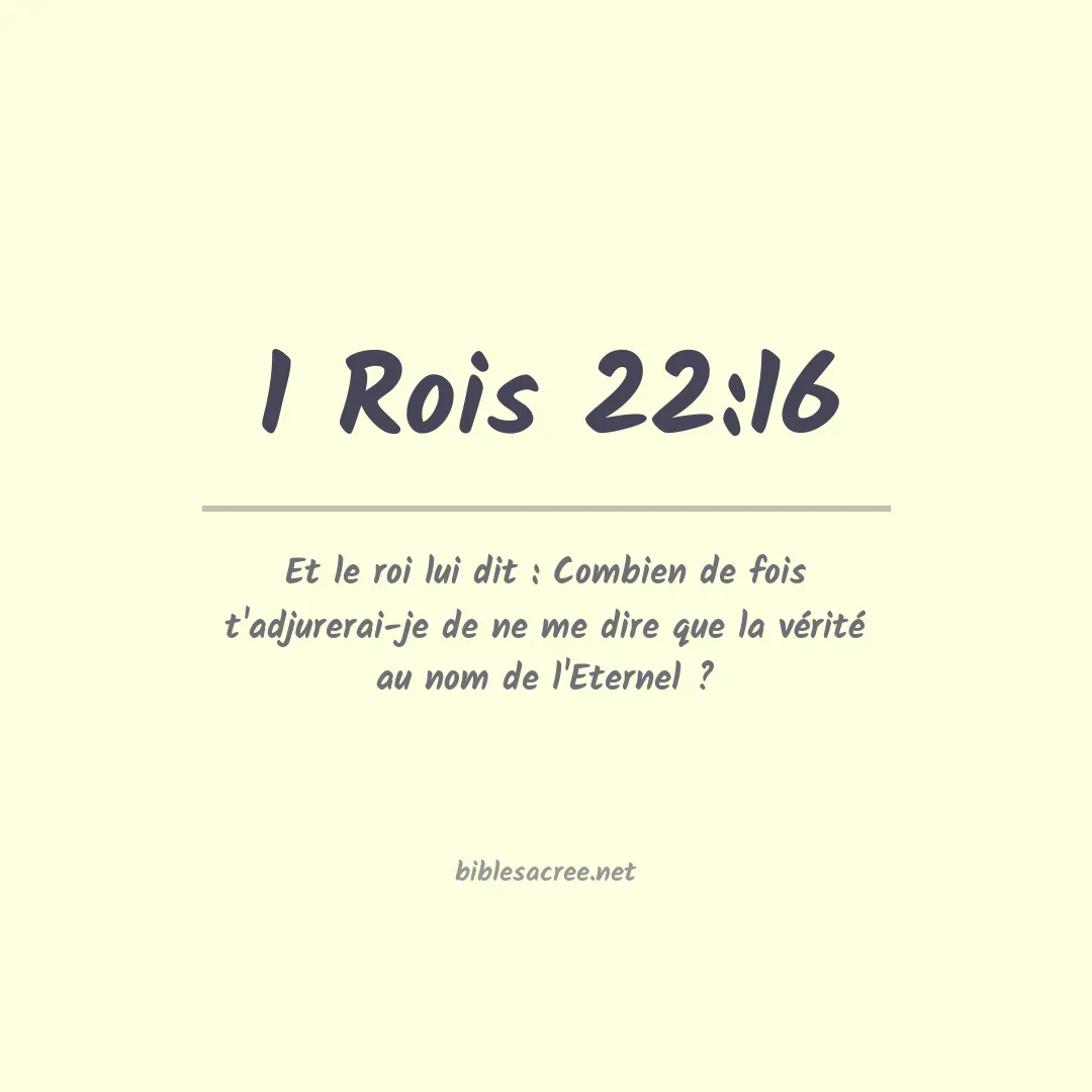 Le verset 1 Rois 22:16 est une demande d'authenticité prophétique faite par le roi Josaphat qui demande au prophète Michée de ne dire que la vérité au nom du Seigneur. Dans le contexte du chapitre, les rois d'Israël et de Juda cherchent des conseils divins avant d'aller en guerre, et bien que d'autres prophètes aient annoncé la victoire, le roi Josaphat veut s'assurer que les prophéties qu'ils entendent sont véritablement inspirées par Dieu. Le verset en question pourrait être résumé par la phrase : "Le roi Josaphat insiste pour que le prophète Michée s'engage à dire uniquement la véritable parole de Dieu concernant l'issue de la bataille qu'ils envisagent."