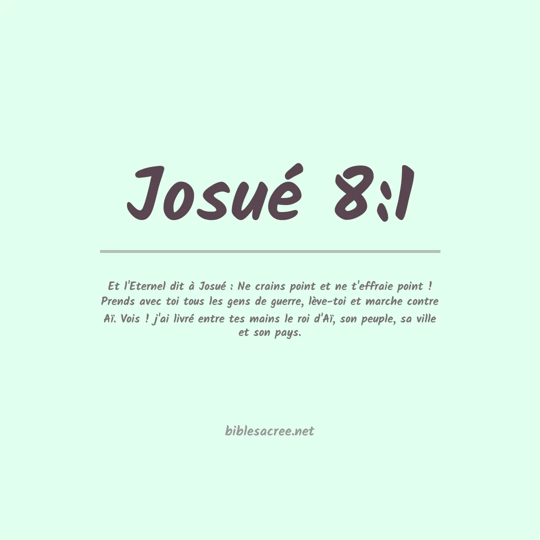 Et l'Eternel dit à Josué : Ne crains point et ne t'effraie point ! Prends avec toi tous les gens de guerre, lève-toi et marche contre Aï. Vois ! j'ai livré entre tes mains le roi d'Aï, son peuple, sa ville et son pays.